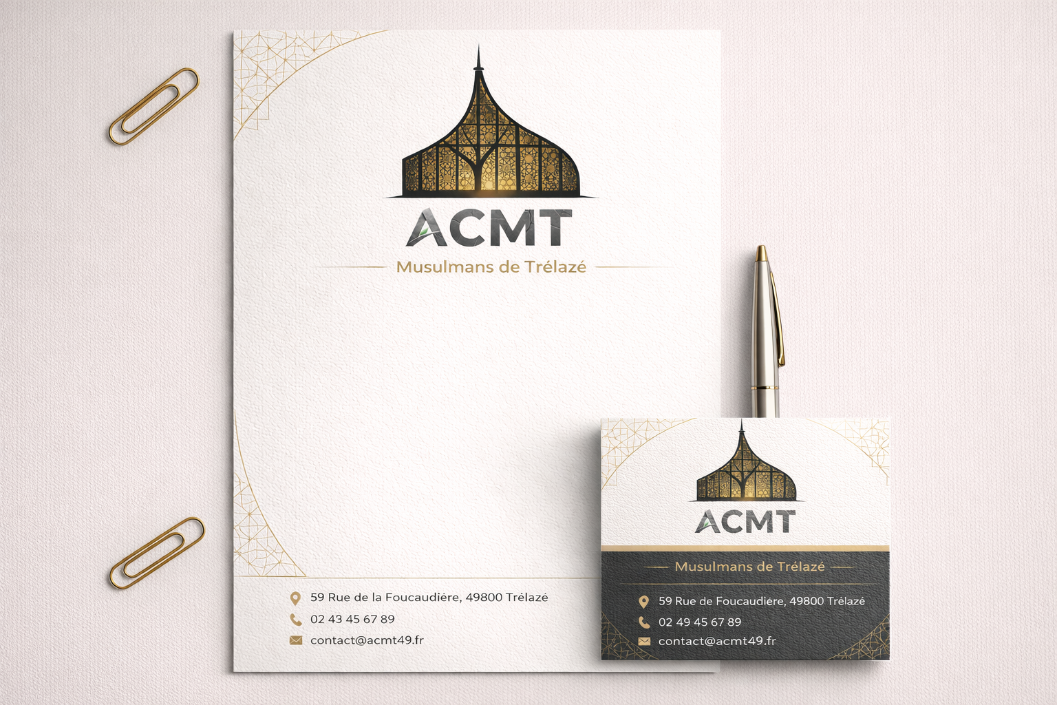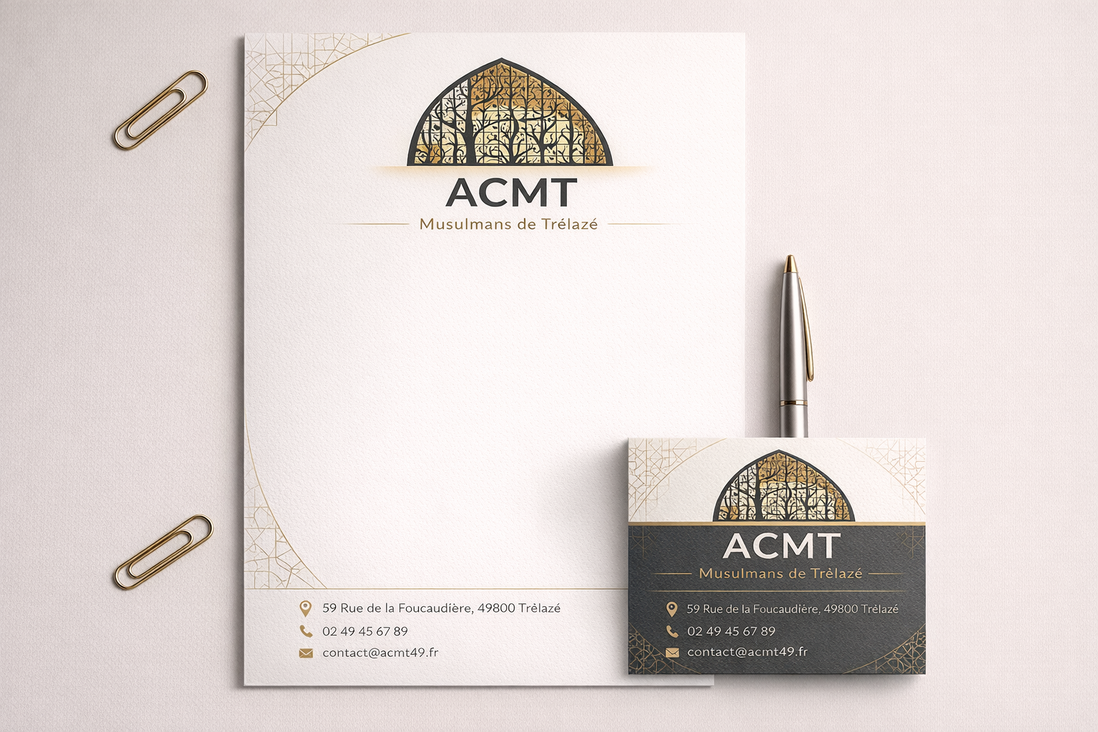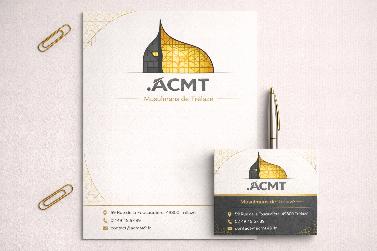 En résumé : Ce logo est une synthèse visuelle entre hier et aujourd’hui. En utilisant la texture de l’ardoise locale pour soutenir une structure de lumière, il affirme que l’ACMT est une institution solidement enracinée dans le sol de Trélazé, tout en restant un phare spirituel et culturel moderne et ouvert.